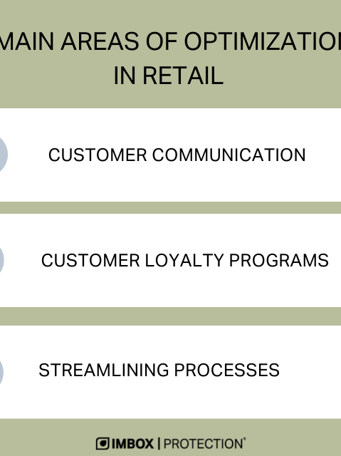 The main three areas of optimization within retail include communication with the customers, customers loyalty programs and streamlining processes to improve order tracking.